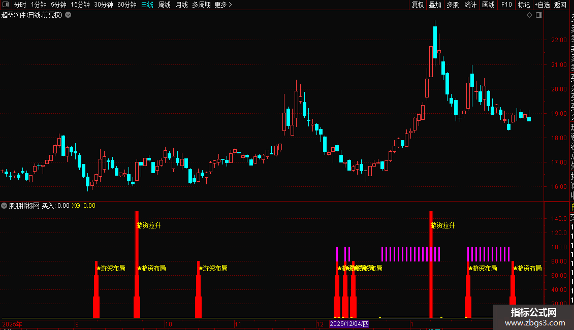 幅图指标核心通过价格涨幅筛选 + 量能结构背离 + 中期价格趋势三重逻辑,识别 A 股个股中 “游资拉升” 异动信号、“游资布局” 买入信号,同时统计 60 日内买入信号触发次数,在副图中直观标注各类信号,辅助捕捉游资介入的量价共振机会。