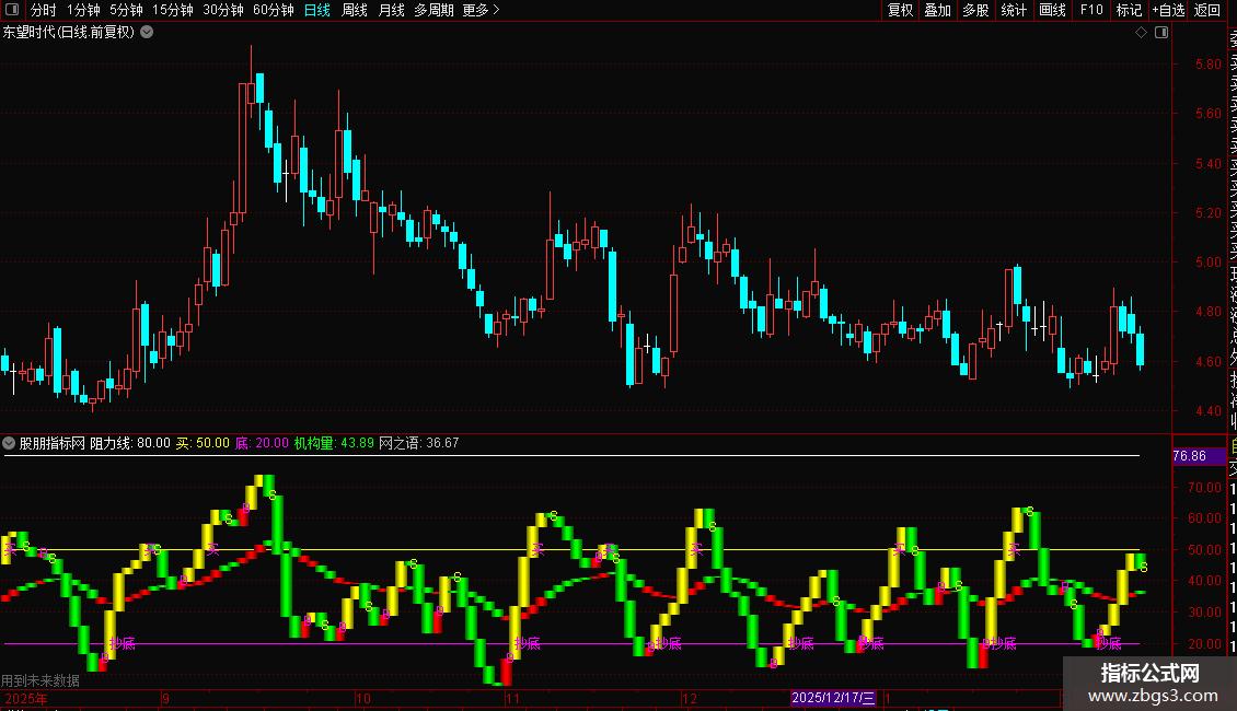 2. 参考线:提供阻力位(80)、买入参考位(50)和底部参考位(20)。
