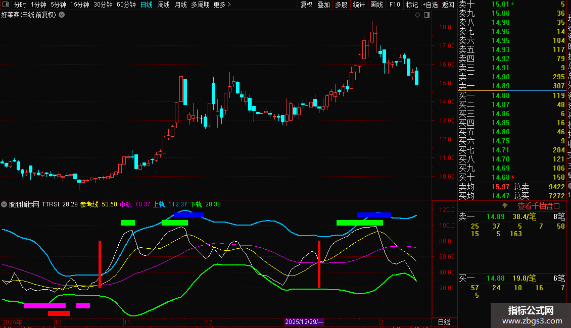 这是一个基于RSI原理的多维动量指标,名为TTRSI。它综合了收盘价、最高价、最低价、开盘价相对于其短期均线的强度,并加入了与大盘指数的关联度分析。