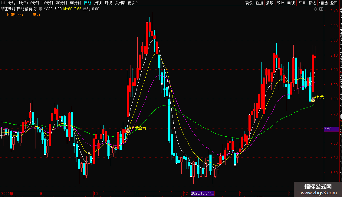 指标主要功能是监控主力资金动向与筹码集中度,识别个股所属板块,并捕捉主力吸筹结束后的爆发点。它通过计算平均成本与市场筹码分布,判断主力是否完成低位建仓。操作策略为:当出现“九天腾龙”或“九龙合力”信号,且伴随放量阳线突破时,视为强力买入时机;红色柱体代表主力积极持仓可跟进,需结合行业板块热点操作。