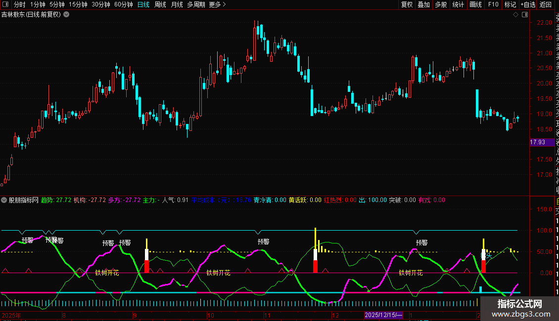 1. 趋势与机构线:通过“趋势”和“机构”两条曲线,判断市场多空力量对比。其金叉(机构上穿趋势)被标记为“铁树开花”,是重要关注信号。