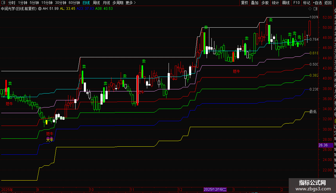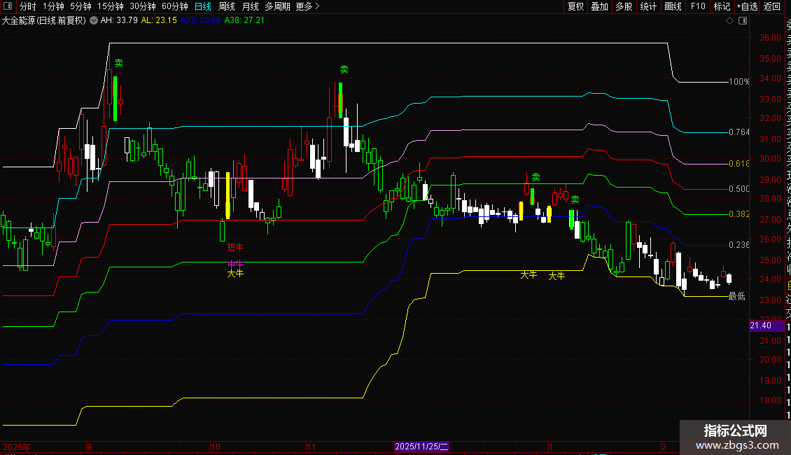 2. 黄金分割网格(6条彩带):自动计算近期100日高低点,绘制0.236、0.382、0.5、0.618、0.764及极限位六道关键比例线。这些彩色区域并非精确点位,而是标志性的潜在支撑/阻力带,价格在这些区域附近结合能量信号将产生高价值交易提示。