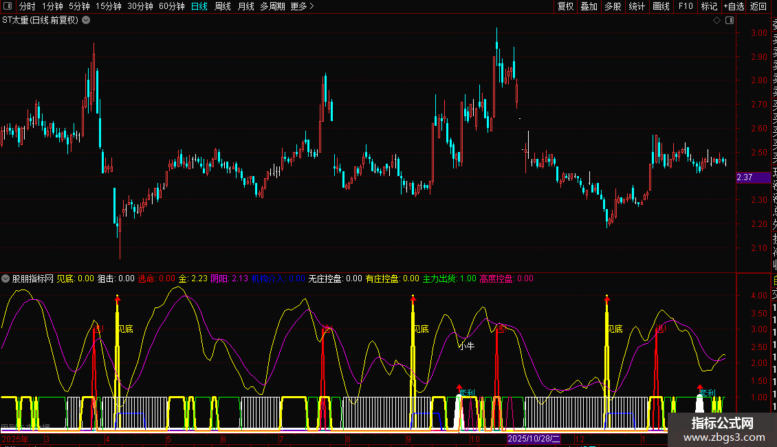 指标将多种信号(如见底、买入、卖出、资金状态)集成在一个副图窗口中显示。