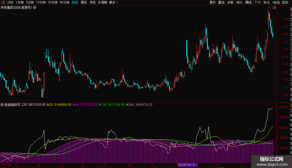 指标通过计算日内分时数据,分析资金流向。核心是“主净入”,由主买与主卖差值求得,代表资金净流入。ZJS为当日累计净流入值。后续均线(M20、M60、M120、M240)用于平滑ZJS,形成多周期趋势线,辅助判断资金流向的短期与长期态势。