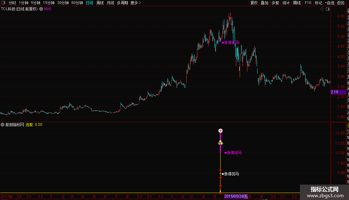 DRAWTEXT(FILTER(XG=1,5),LOW-0.05, ' ★涨停回马'),COLORFF00FF;