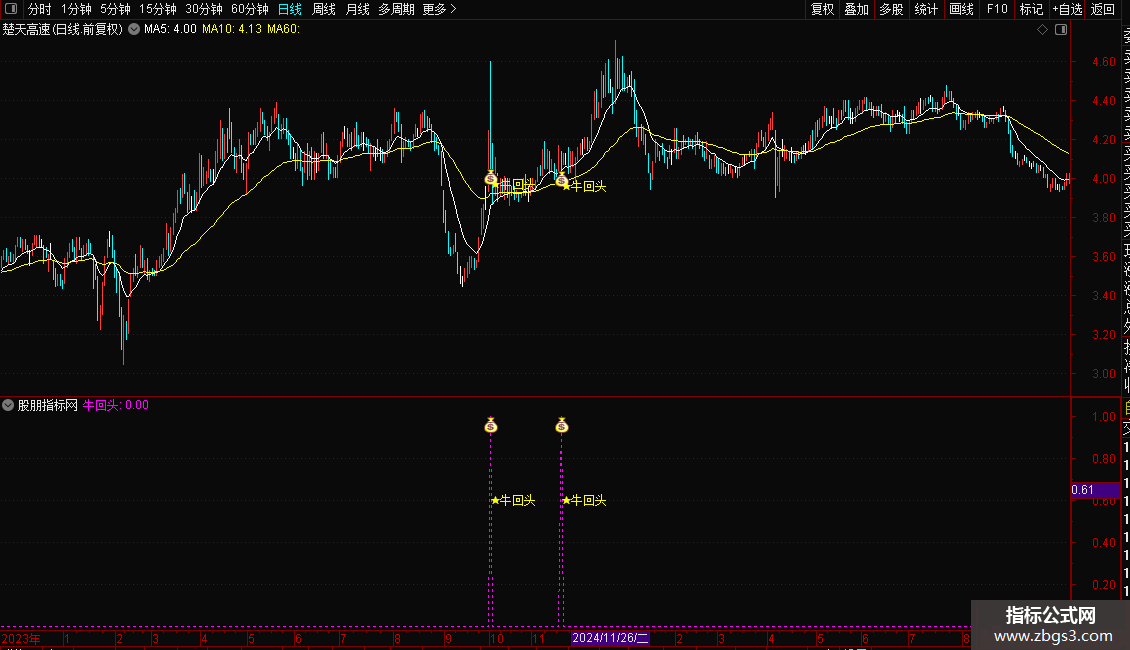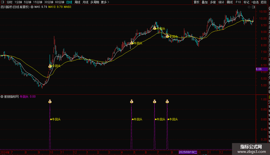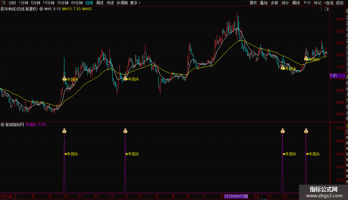 副图:在副图窗口加载。以曲线形式输出“牛回头”信号,信号出现时同样有图标和文字标记。