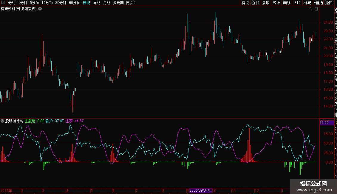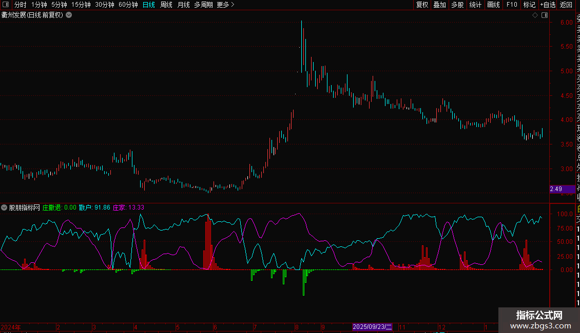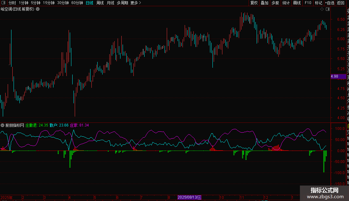 4. 庄家:紫线,代表主力资金动向,与散户线形成对比。