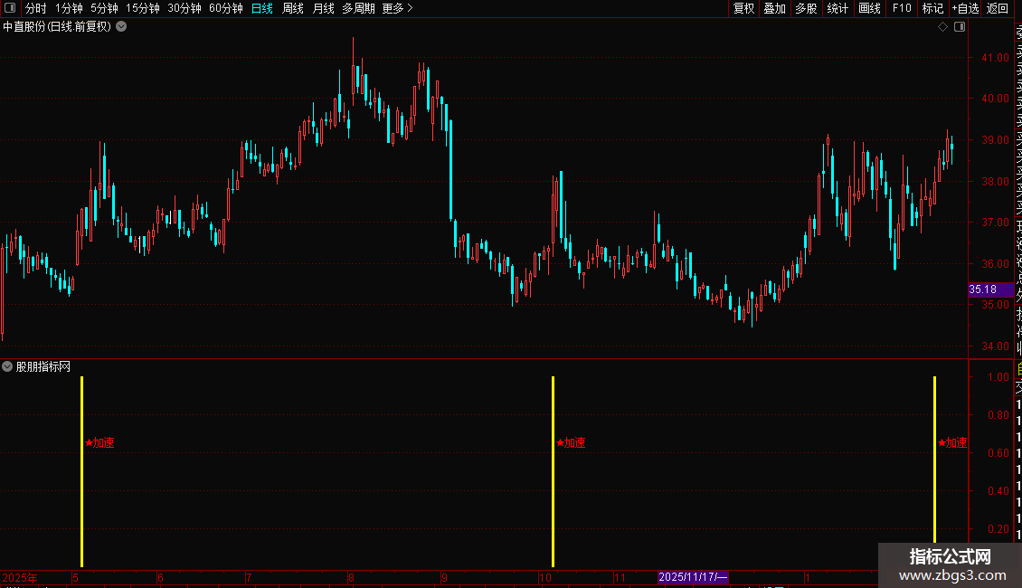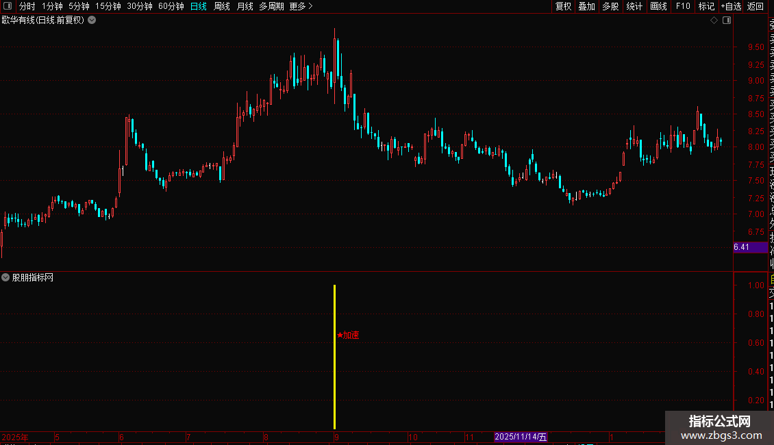 当指标在K线图上出现洋红色的柱状线并伴有“★加速”的文字提示时,表明股价已进入强势拉升区,是激进型投资者的介入良机。建议结合当时的市场热点与成交量变化进行确认,若出现信号时伴随成交量显著放大,则信号可靠性更高。稳健型投资者可等待股价回踩关键均线支撑位不破后再行加仓。止损位可设置在信号出现当日的最低价或关键均线之下。