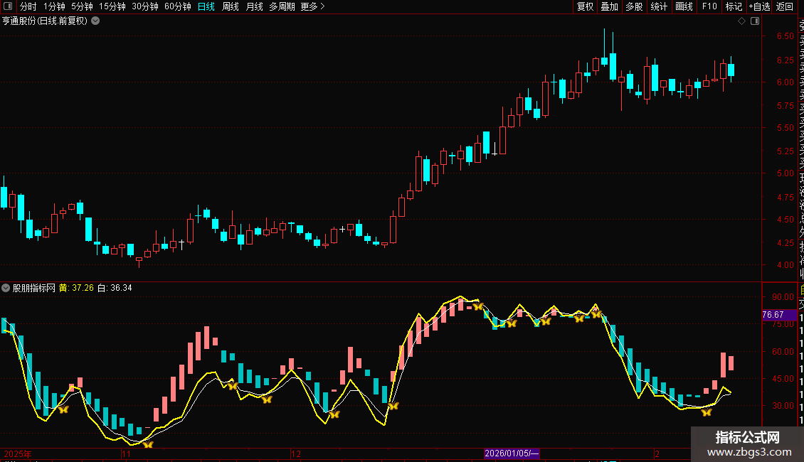 3. 使用“黄线”和“白线”表示趋势强度与平滑信号,金叉时标记图标提示。