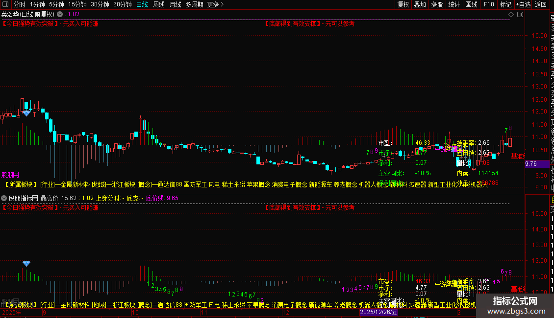 - 主图中红色“今日强势有效突破”“底部得到有效支撑”提示,参考对应价格判断买卖时机;