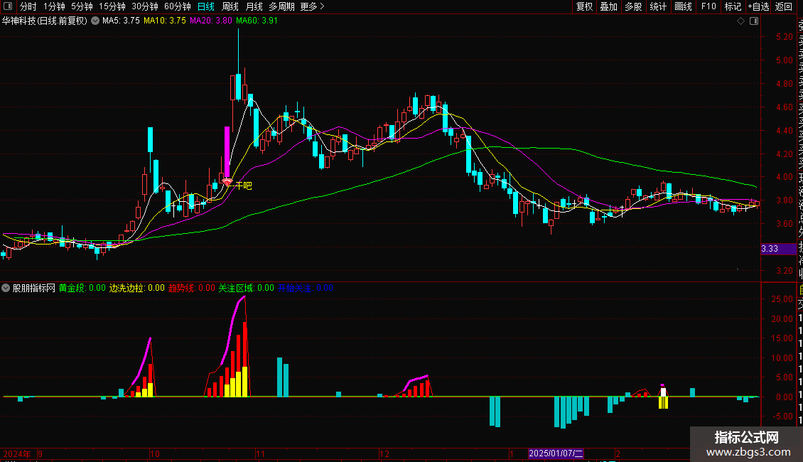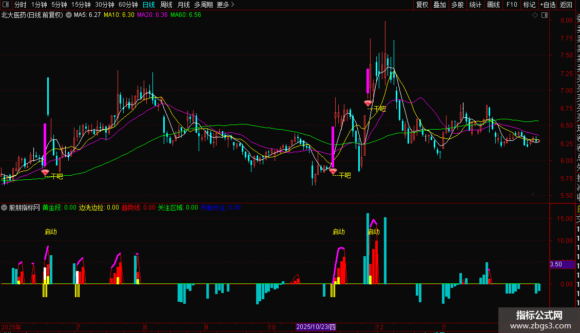 副图“新趋势副图” 聚焦趋势强度与主力行为分析,集成“边洗边拉”“黄金段”“突破4/5”等模块,通过红黄柱状图清晰展示主力吸筹与拉升阶段,并在关键节点自动标注“启动”信号,辅助判断趋势强弱与主力资金动向。