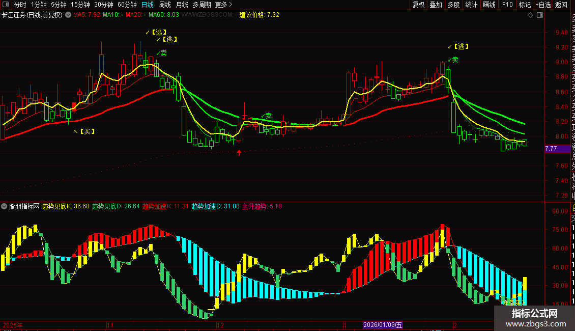 4.主图逃信号与幅图趋势见顶信号同时出现,是最后的逃跑机会,该股票指标信号可辅助股民精准把握离场时机。