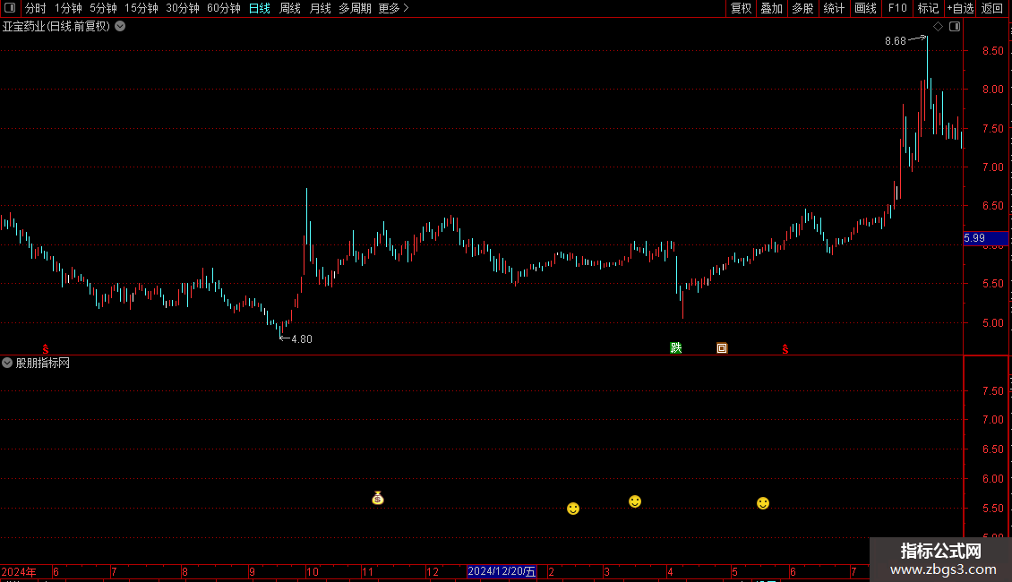2. 第二波信号(VV4): 当35日和70日均线均已站在170日线上方,且35日线上穿70日线时,在K线下方标记笑脸图标。这通常代表强势趋势中的短期加速信号。