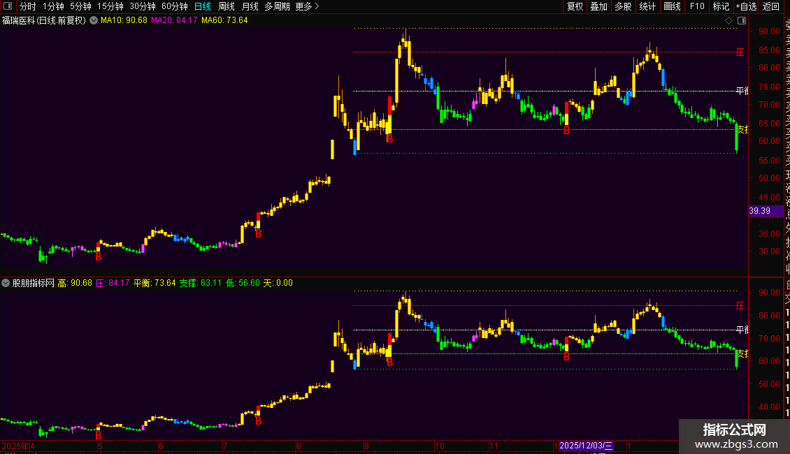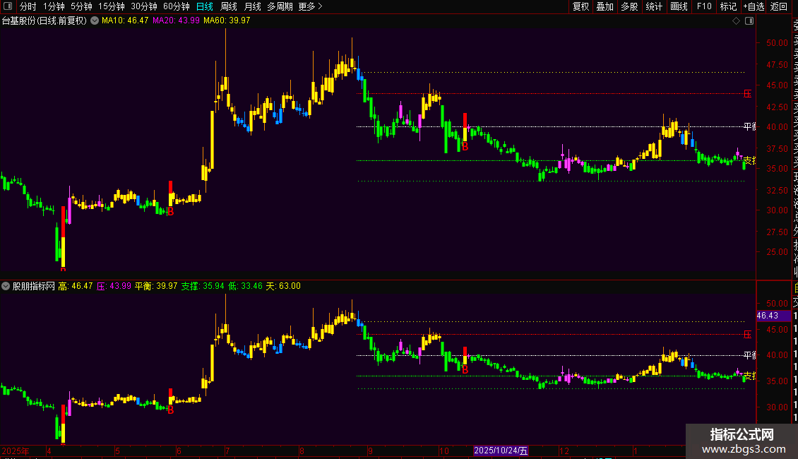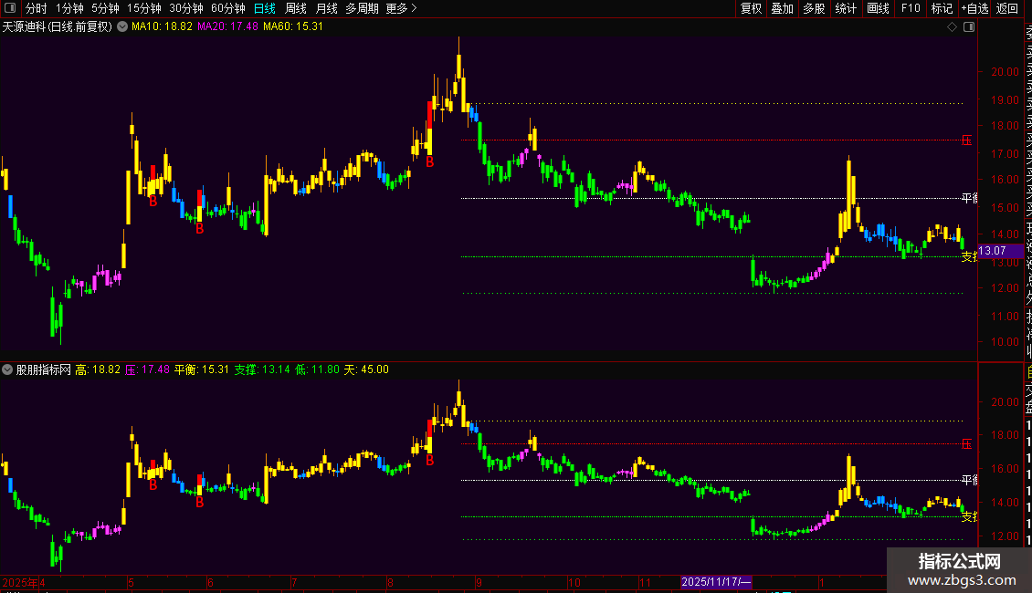 指标在K线图上直接绘制支撑压力线和彩色K线。