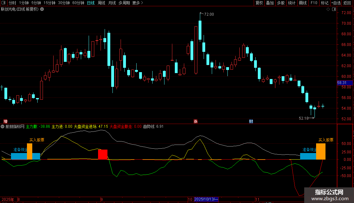 使用要点:指标将个股资金面、大盘资金面与技术趋势结合。使用时,可优先关注“主力进”与“趋势线”同步走强的信号。“买入股票”信号需结合“主力进”状态及大盘资金是否配合进行综合判断。“见顶清仓”信号出现时,应考虑减仓或出场。