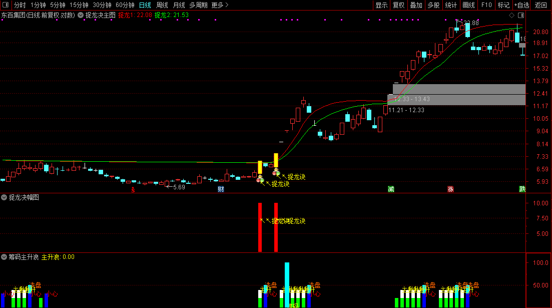 信号确认:当主图出现红色柱状标记及“捉龙诀”文字提示时,视为明确买入信号。
