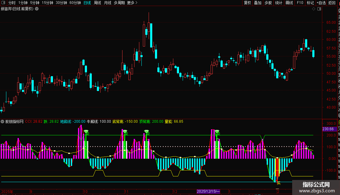 它在传统波动率指标基础上,增加了直观的强弱分区:零轴上方代表多头强势,下方代表空头弱势。特色功能是自动识别“超卖后回升”的买入点和“超买后回落”的卖出点,并通过底部和顶部的背离信号,提前预警趋势可能发生的逆转。
