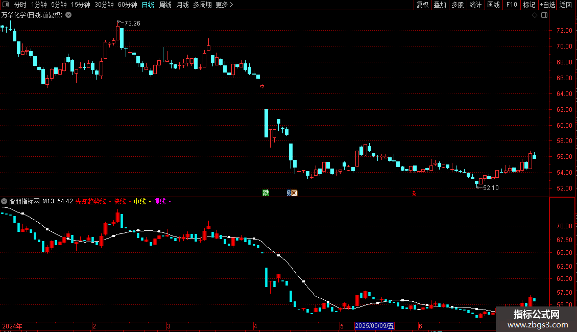 2. 多空趋势线:提供“先知趋势线”(34日均线)以及由快线、中线、慢线构成的一组短期趋势线,用于判断价格的中短期趋势方向。