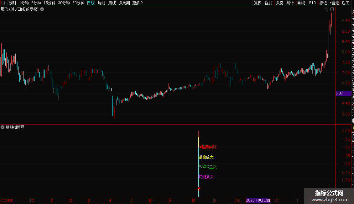 当所有条件同时满足时,指标会在副图区域显示醒目的彩色柱状信号,并标注“强势突破”等文字提示,用于识别可能启动的强势股。