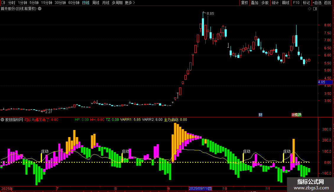 6. 主力启动信号:通过VARR1(一个快速摆动指标)上穿阈值线VARR2来提示短期资金进场或启动迹象,并标注“庄动”文字。