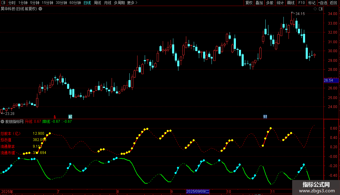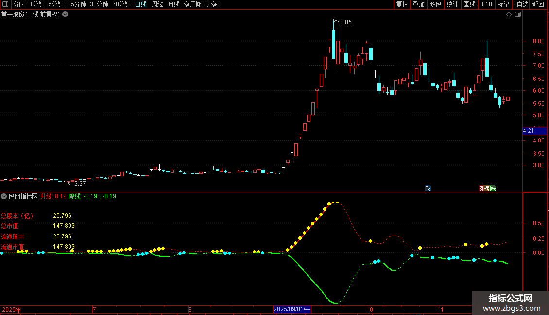 1. 财务数据显示:在画面左上角固定位置显示总股本、总市值、流通股本、流通市值四项关键财务数据,数值以亿为单位。