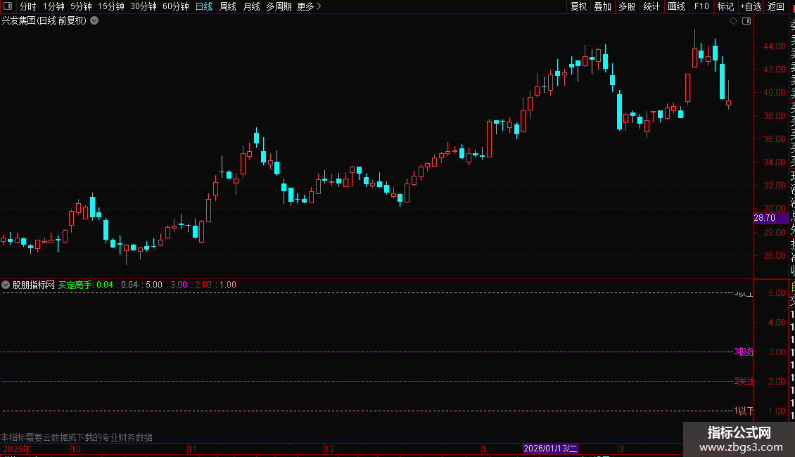 核心计算基于机构持股比例与流通盘的比值,以数值形式在主图区域显示。数值通过不同颜色和位置进行可视化区分:低于1为绿色,表示空仓观望;1-2之间为绿色粗线;2-3之间为红色粗线,提示关注;3以上为紫色粗线,表示极好状态;超过5则用紫色柱状线警示出货风险。