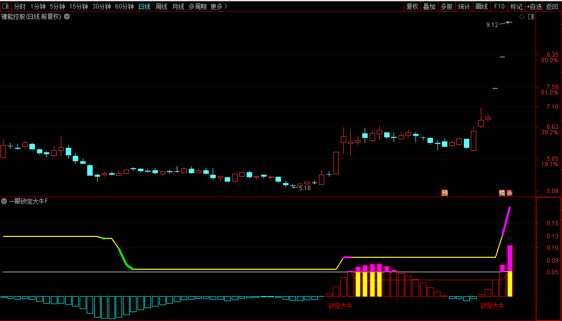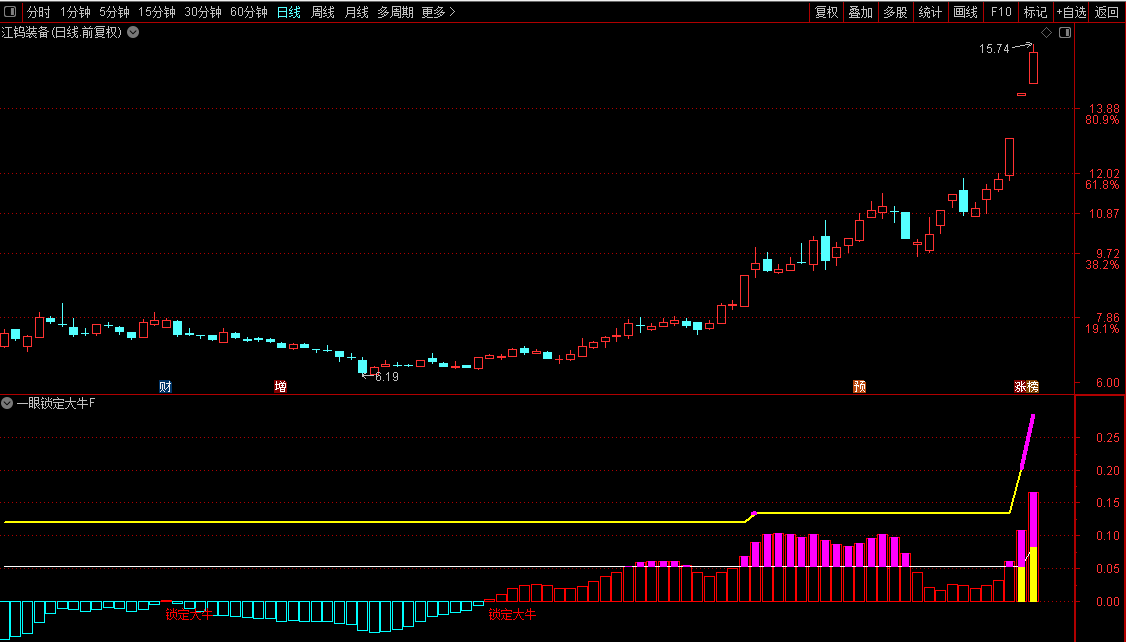 指标融合了价格波动监测与多周期能量分析,其核心逻辑在于通过识别股价在特定周期内的关键价位突破,并结合日、周、月、季四重周期的MACD能量柱,对个股的强势阶段进行立体化筛选。