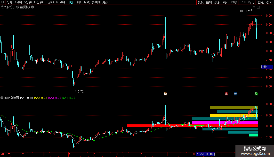 3. 在主图K线上,以不同颜色的粗柱状条直观显示这些价格带。柱状条的长度(即显示的时间跨度)由对应价格带的最大成交量占总成交量的比例决定。成交量越集中的价格区域,其柱状条在图表上横向延伸得越长,代表该区域可能构成重要的支撑或阻力带。