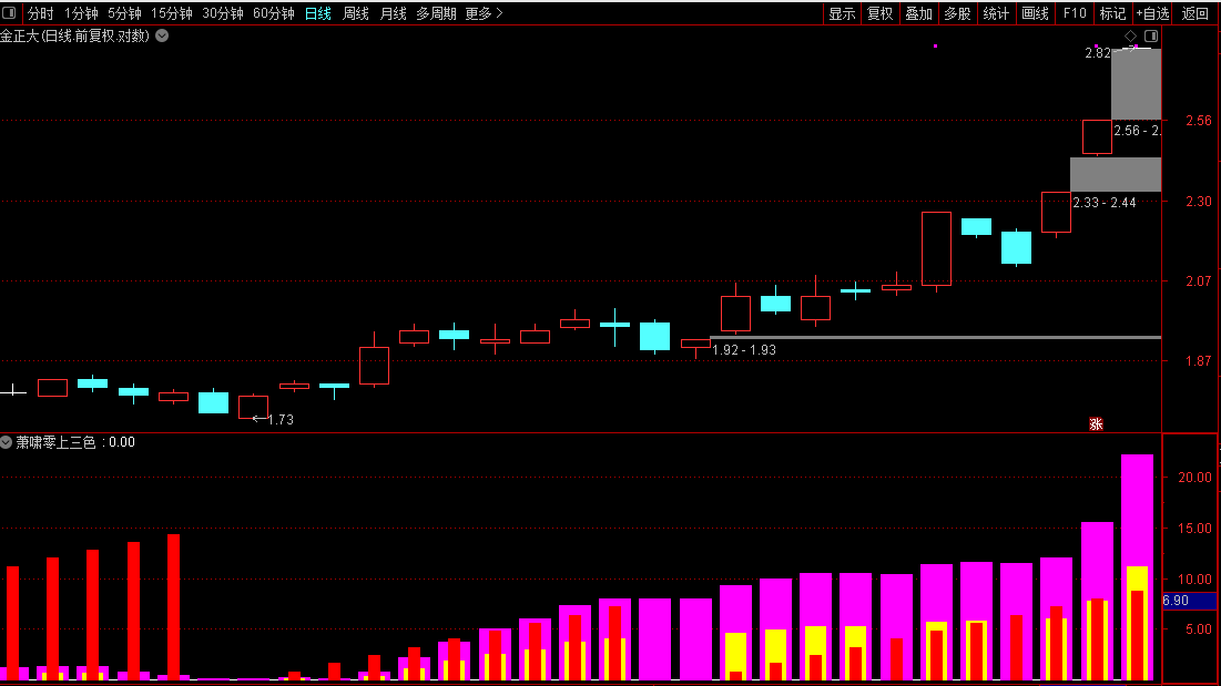 1.整个副图上只有四种颜色的柱体,我们只要在0轴上方同时聚齐粉黄红三种颜色的柱体就行。