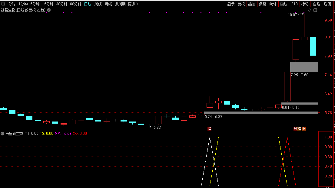 通达信【倍量跳空缺口不补】副图/选股指标后市走势猛如虎源码