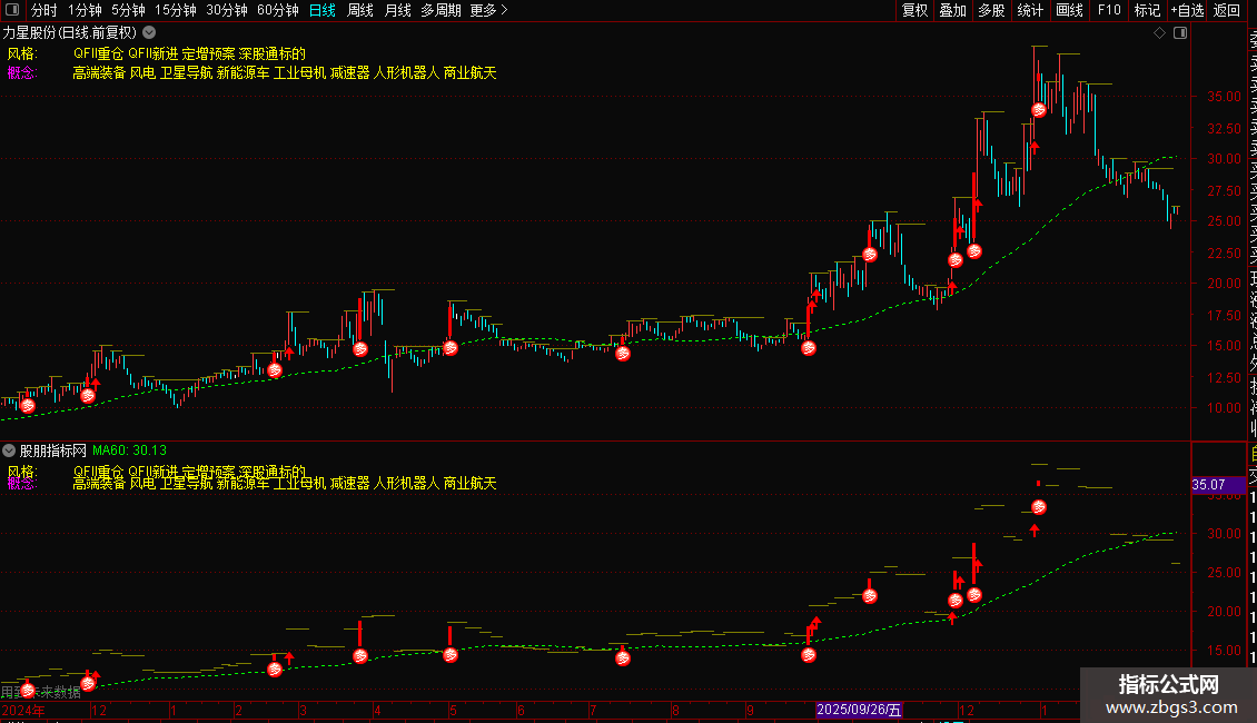 指标中的买入条件(`S29`, `S30`)非常严苛,旨在过滤杂波,因此信号可能较少。