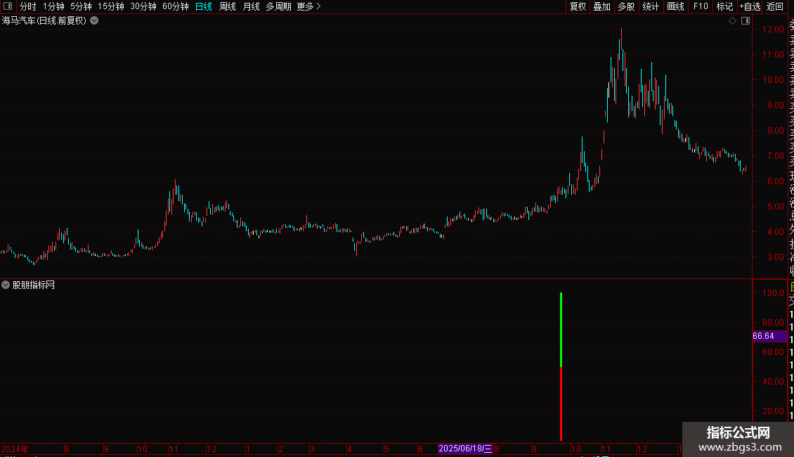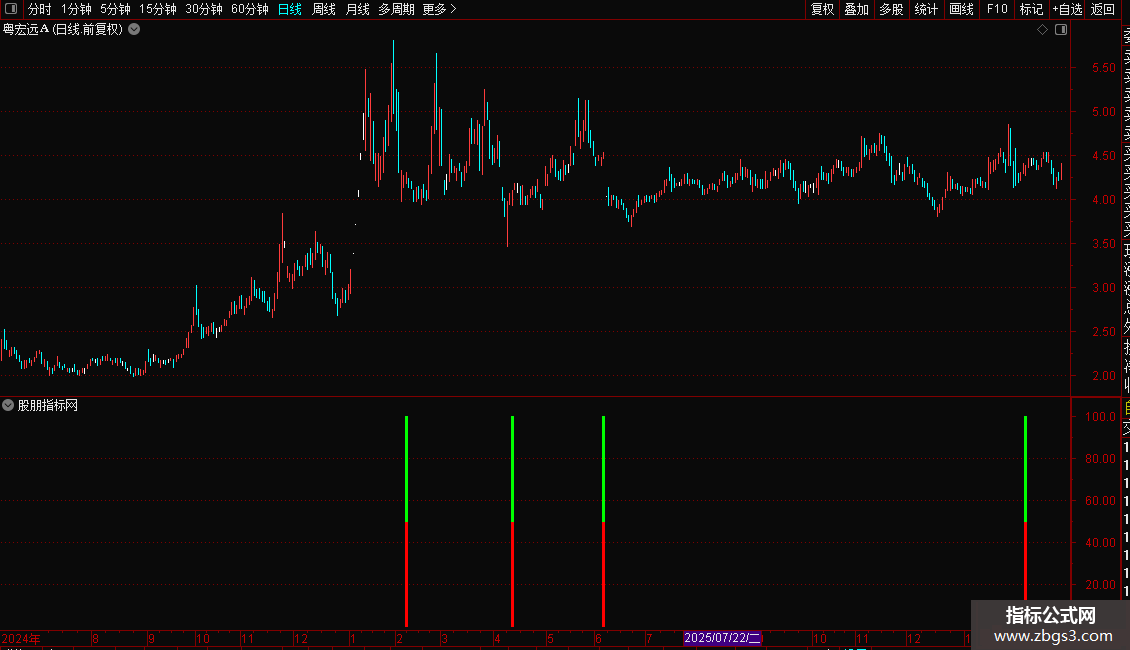 信号解读:当图表上出现红色和绿色的柱状线时,代表系统发出了一个潜在的买入信号。这表明该股在强势背景下完成了“先跌后涨”的形态转换,可能即将开启新一轮上涨。