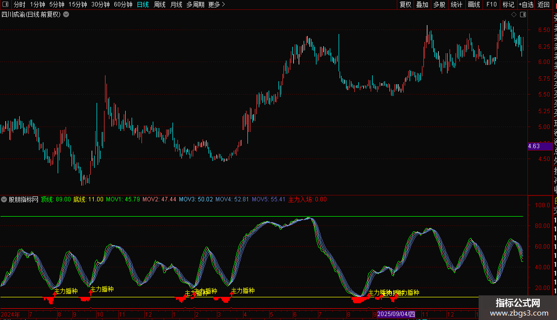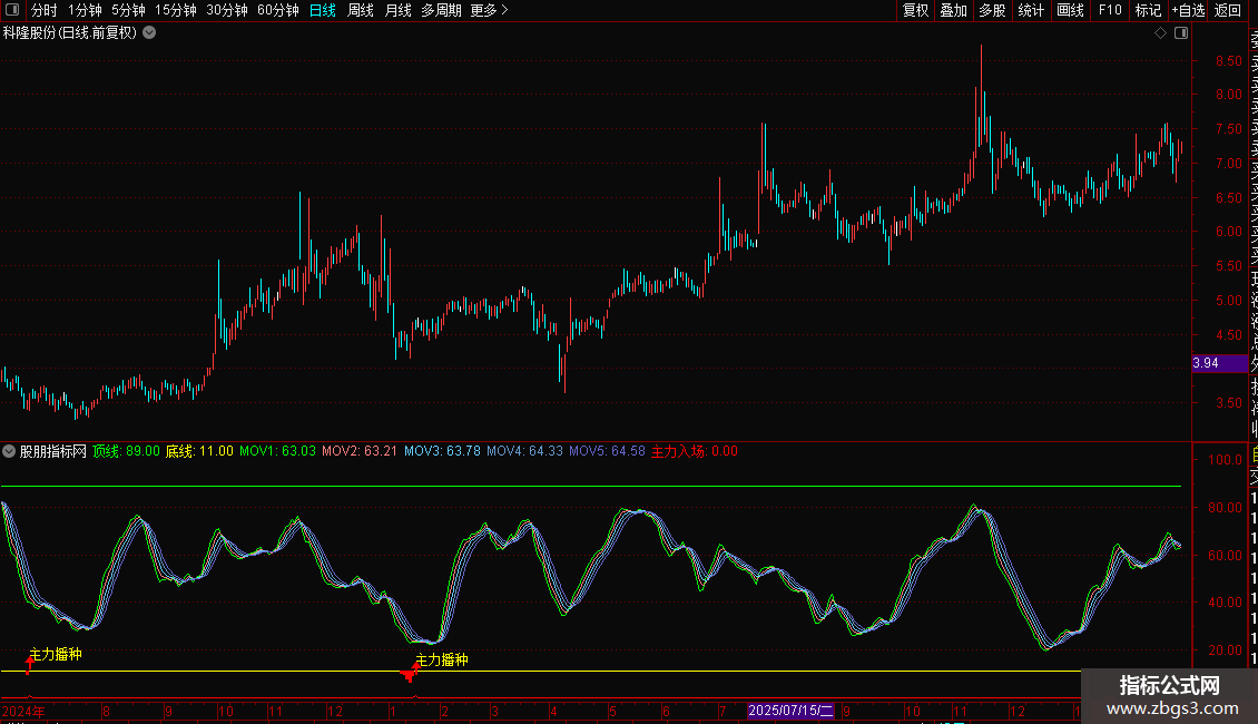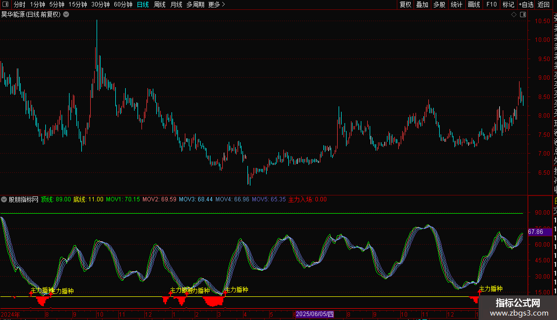 核心买入信号:当出现“主力播种”的图标和文字提示时,表明指标发出主力入场信号,可作为潜在的买入或关注时机。