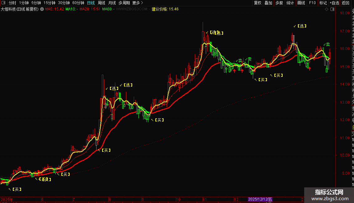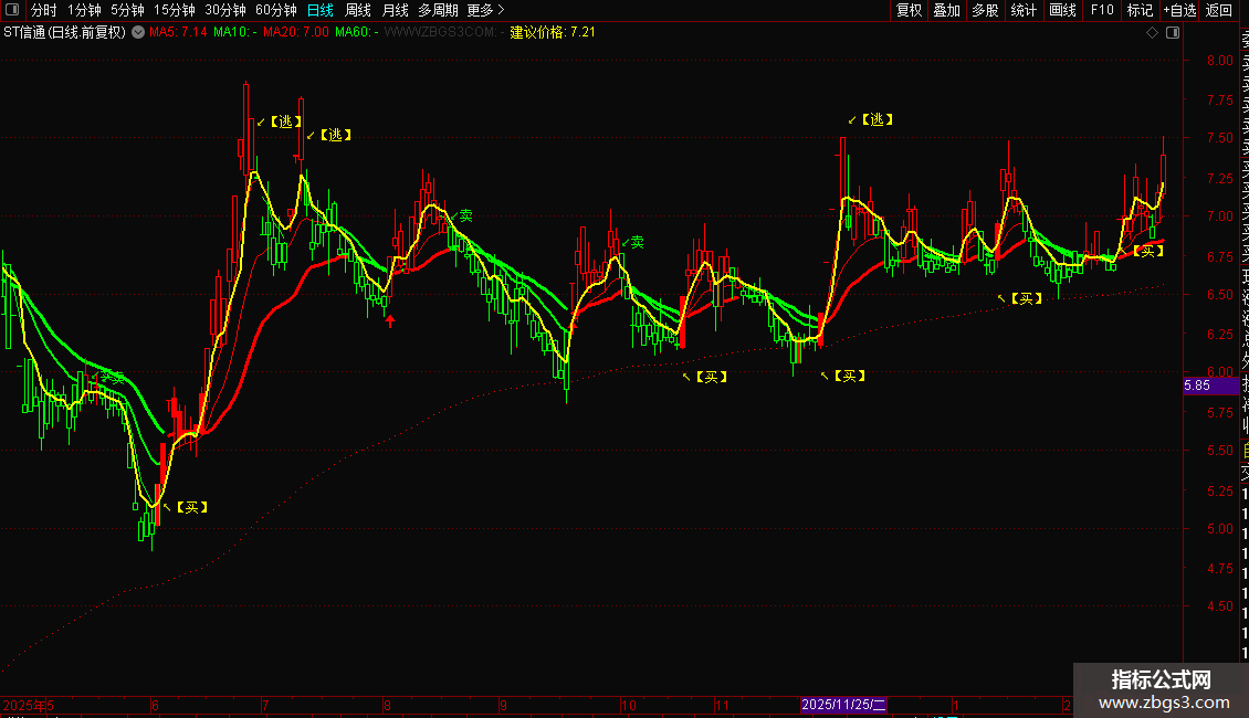 指标是一个综合型趋势跟踪系统,核心功能是通过多周期均线判断价格方向,并动态计算支撑与压力区间。操作策略上,当短期均线上穿长期均线且价格位于支撑区上方时,视为买入或加仓信号;反之,当均线下穿且价格触及压力区时,执行卖出或逃顶操作。指标还通过红绿柱状图直观展示多空力量转换,辅助投资者在趋势确立时进场,在拐点出现时离场。