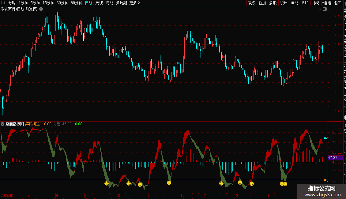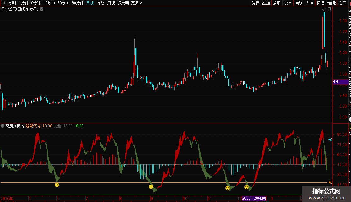 筹码沉淀指标包含副图与两套公式,是针对A股筹码动向分析的实用工具,核心围绕**筹码沉淀度**、**洗盘阶段**、**底部反转信号**三大维度设计。副图公式通过18日/120日高低价区间计算筹码活跃度,结合SMA平滑算法绘制筹码沉淀线(18)、洗盘线(45),以红绿带宽展示筹码供需,黄/蓝柱体提示资金流向;公式则聚焦“筹码沉淀线上穿活跃度均线”的关键反转信号,精准筛选底部筹码企稳个股。