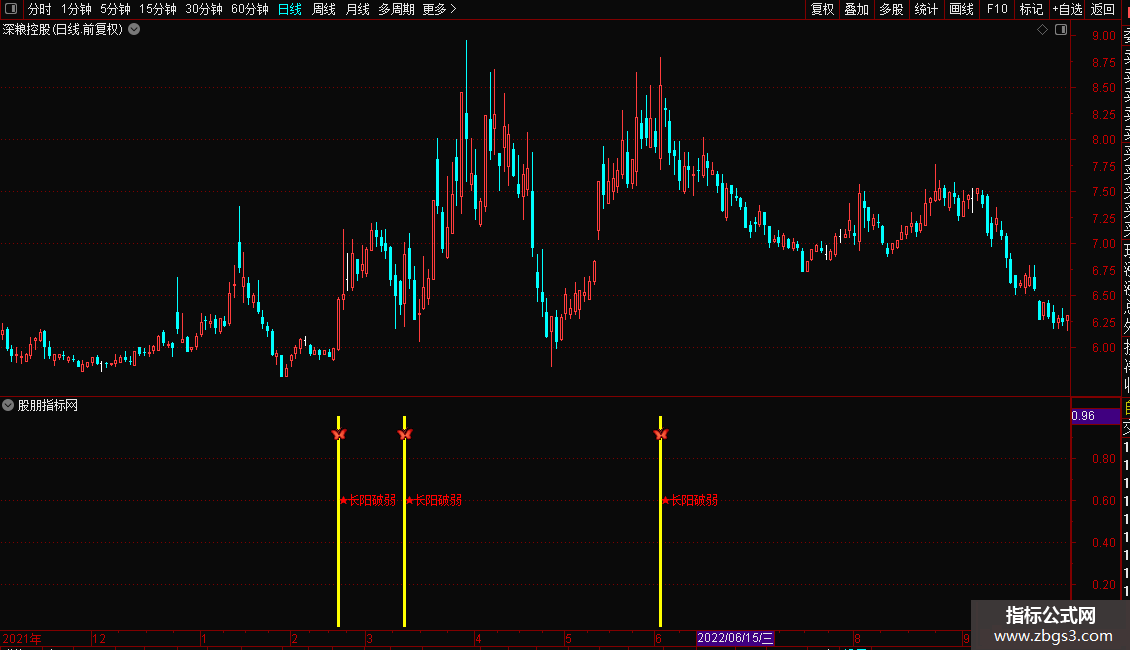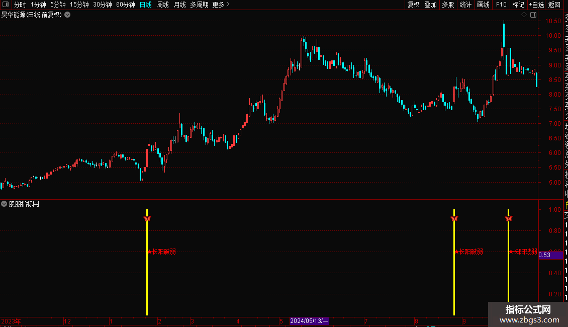 1. 副图公式:在通达信K线副图界面加载公式,当出现“★长阳破弱”彩色柱体和图标时,代表个股结束短期弱势,出现长阳突破信号;