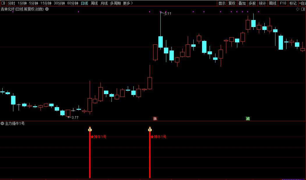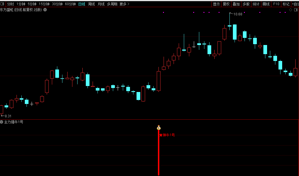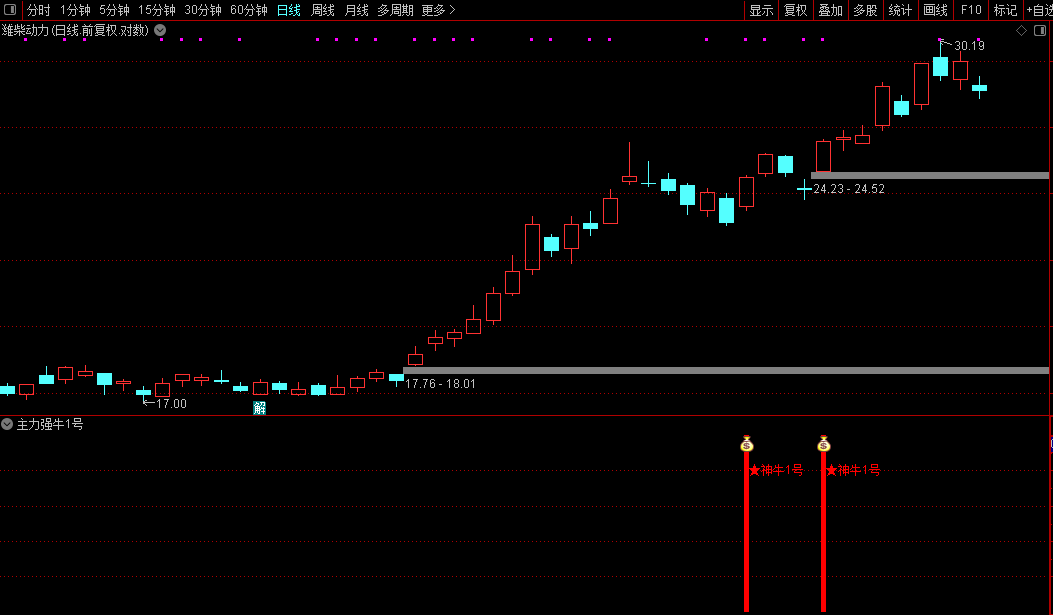 以强势上涨为目的的“强牛1号”公式,多以大阳或涨停板出现,