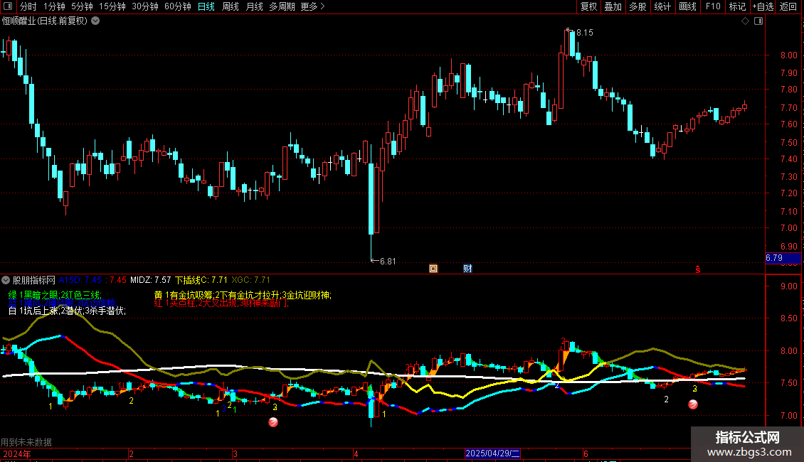 4. 综合买卖点提示:通过文字“1”、“2”、“3”和图标,标记多种策略的潜在信号,例如: