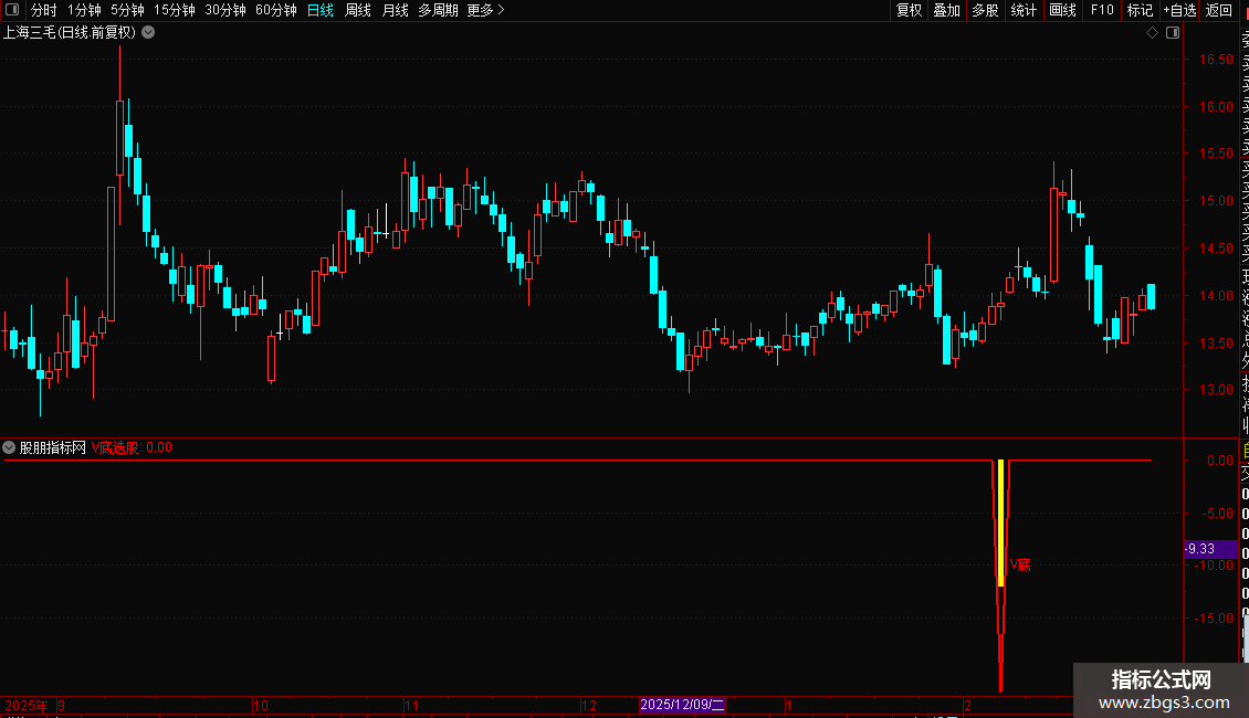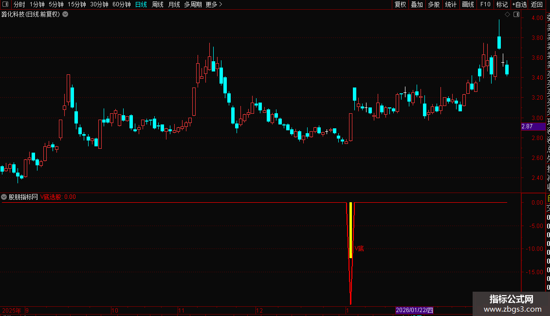 当指标在图表上出现“V底”文字及黄色柱状提示时,意味着可能的V型底部已经形成。这通常预示着下跌趋势结束,新的上涨趋势即将开始。投资者可将其作为中短线的买入参考信号,结合成交量等其他因素综合判断,以把握潜在的反弹或反转行情。