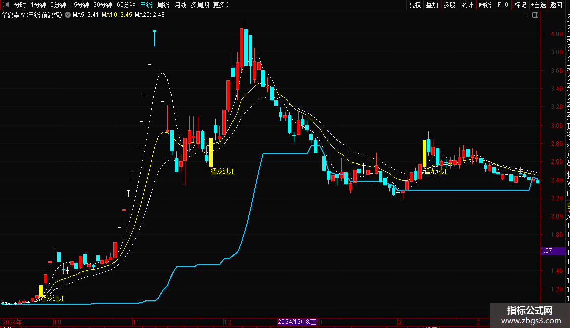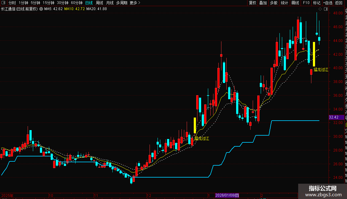 1. 主图公式:导入后在K线图显示关键均线与主力成本,当出现黄色“猛龙过江”文字时,代表个股当日拉升力度强、收盘价逼近最高价,是短期强势信号;