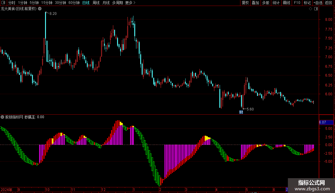 指标通过多组均线、价格偏离度及成交量分析,识别趋势状态与底部信号。主图以柱状线区分“持股”、“持币”、“反转”、“洗盘”四种状态,并设有“抄底王”文字标记,提示潜在底部反弹机会。适用于中短线趋势跟踪与超跌反弹捕捉。
