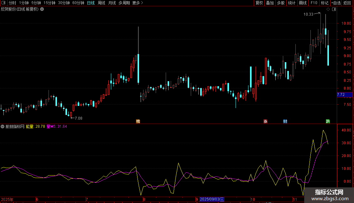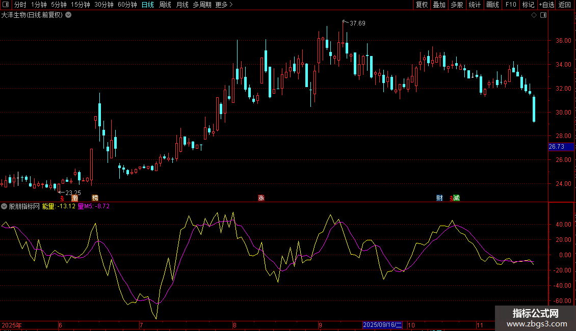 主指标“能量”基于OBV(累积成交量)计算,反映资金流入流出强度。