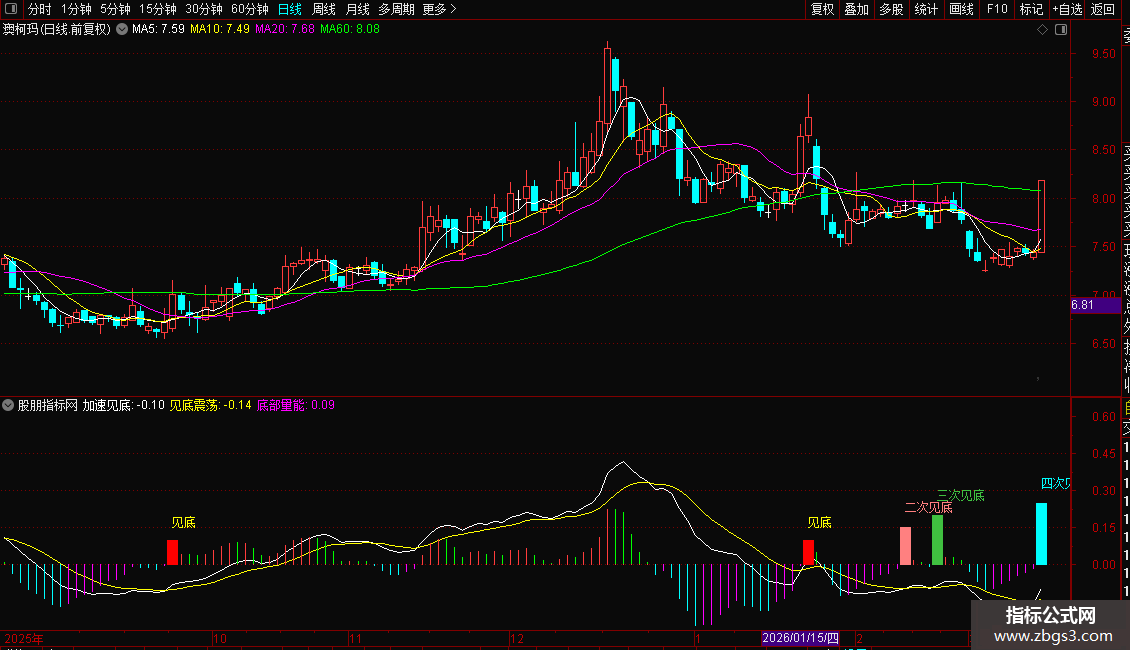 2. 核心信号为副图六次及以上见底+主图“即将拉升”标注,需结合60日均线确认;