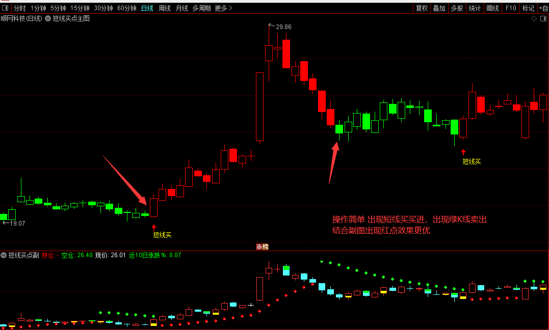 绿色K线是不操作的。简单说就是"红色持有,绿色观望",信号出现买,当绿柱时卖出。