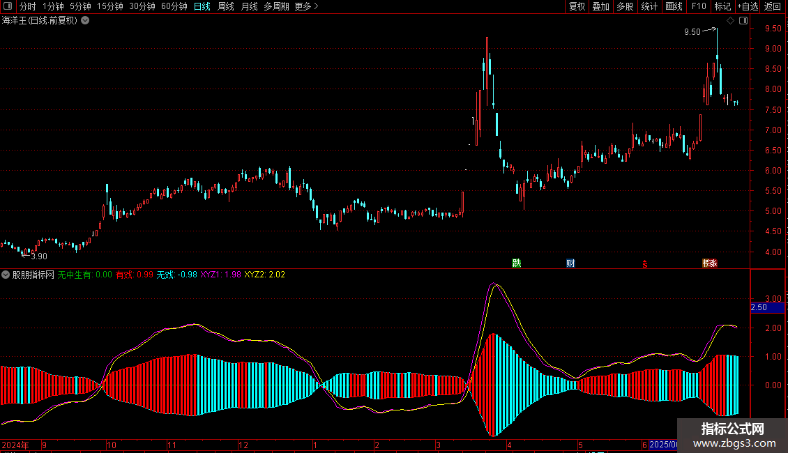 指标通过计算两条不同周期EMA的差值比率,构建“有戏”与“无戏”两条主线,反映短期趋势强度。其差值XYZ1与均线XYZ2的对比,用于判断多空状态,并通过柱状图直观显示。整体用于捕捉价格动量的变化与转折点。