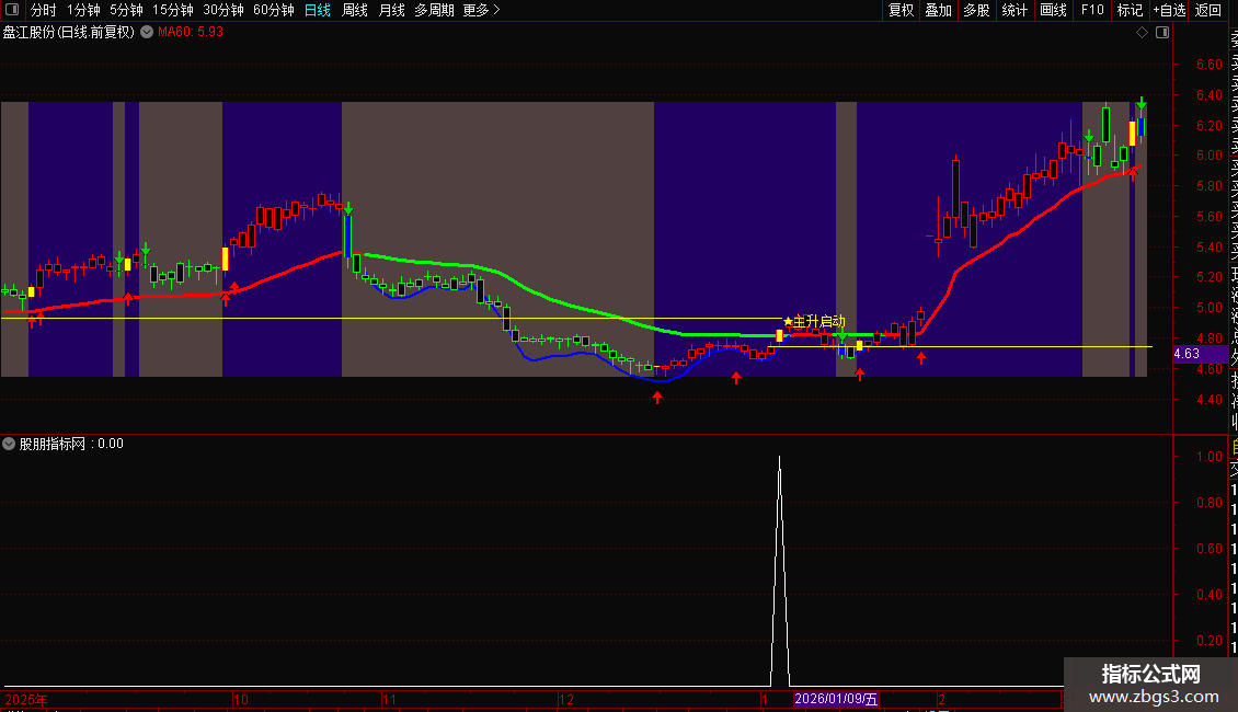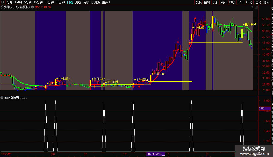 1. 主图核心:通过色彩、图标、文字标注直观区分主升/弱势区间,量能异动星标锁定启动点;