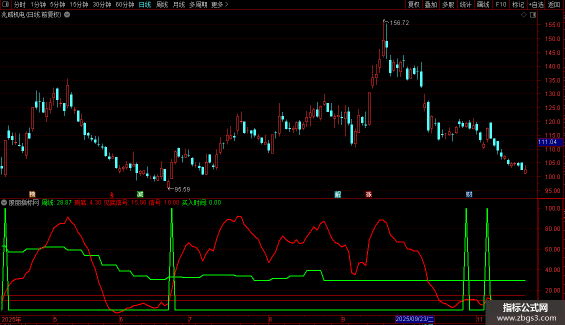 日线买入信号:当日线J值向上突破15或10时,标记为“买入”或“买入时间”信号。