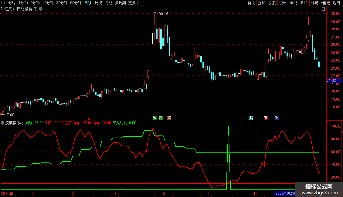 日买入:=IF(CROSS(测底,见底信号),70,0){,COLORGREEN,LINETHICK2};