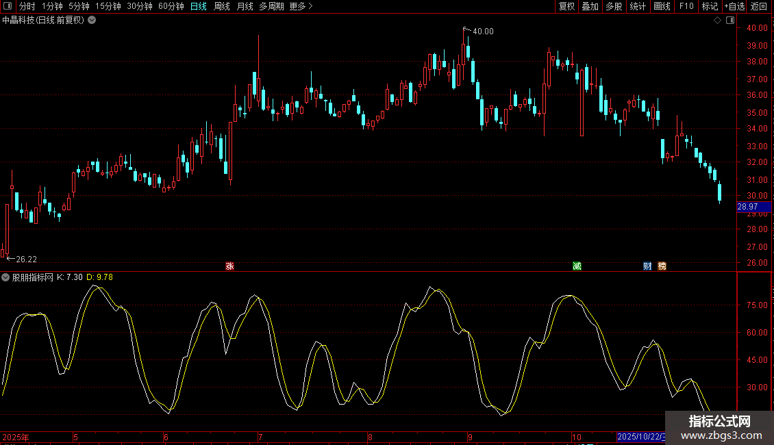 指标基于随机震荡指标(KDJ)原理构建,通过计算K值与D值来识别趋势与买卖点。