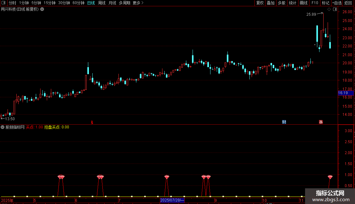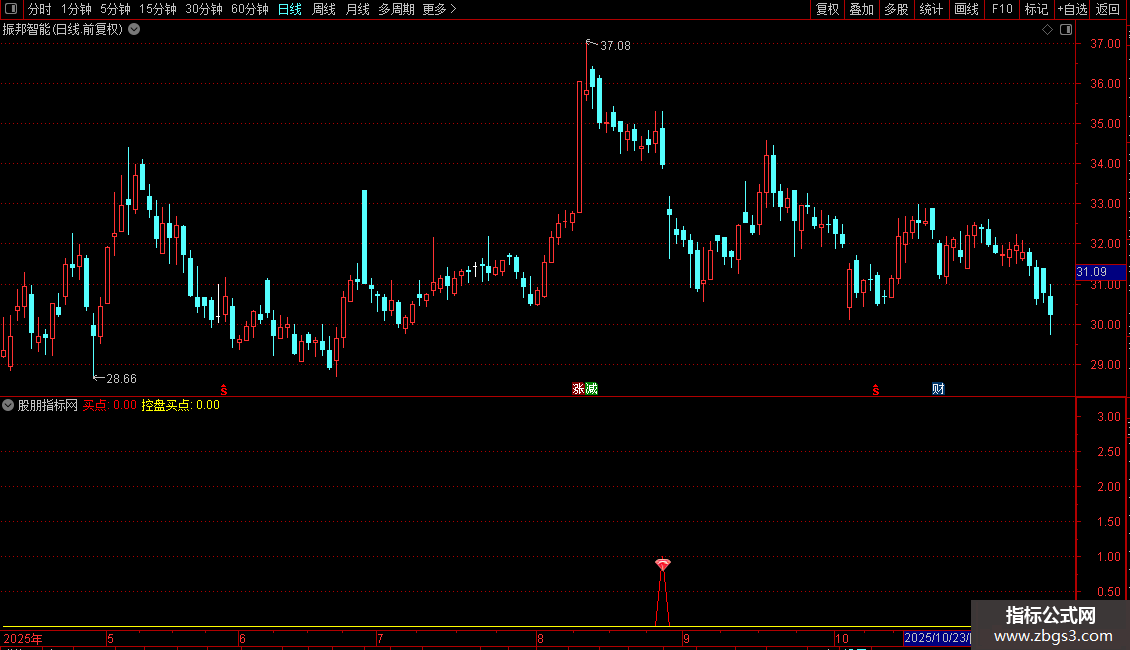 2. 控盘买点:在基础买点出现后,进一步要求资金呈现“有庄控盘”的流入状态,并且股价上穿短期趋势线。这是更强烈的买入信号,会在副图以特殊的蓝色柱状和黄色文字标注。